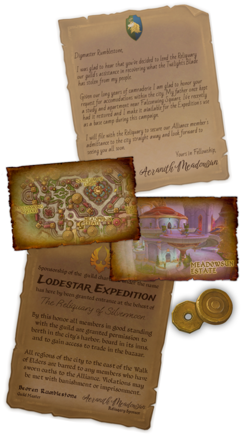The opening of the Dragon Isles paved the way for a new era of discovery and exploration and adventurers from across Azeroth flocked to the newly uncovered shores to answer the call. From among their ranks the Lodestar Expedition was formed by a group of friends as they explored mysterious lost ruins in the Azure Span.When the Radiant Song echoed across Azeroth the Lodestar Expedition was spurred into undertaking its first full campaign on the Isle of Dorn. After traversing the depths of Azeroth and the wilds of Ka'resh the Lodestar Expedition is now welcomed into Silvermoon by their Reliquary contacts. On the heels of the Twilight's Blade the Expedition's aim is to return stolen relics and artifacts while discovering all they can about the strange growths overtaking the region.To bolster their ranks the Lodestar Expedition has thrown their doors open. Now flyers advertising the chance for adventure can now be found in every port of call whether they be Horde, Alliance, or of no allegiance whatsoever.